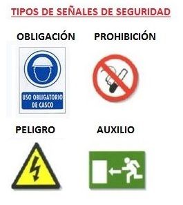 Hay cuatro tipos: de Obligación, de Peligro, de Auxilio y de Prohibición. Son de Obligado cumplimiento en los centros de trabajo. Las señales de seguridad, también llamadas Señalamientos de Seguridad, desempeñan un papel vital en la comunicación de la información en materia de seguridad. Pueden reducir al mínimo el riesgo de un accidente que ocurre en un lugar de trabajo y son una manera fácil y comprensible universalmente de conseguir hacer llegar su mensaje a todo el mundo. No obstante, los empleadores deben proporcionar información a los empleados sobre el significado y los requisitos de todos los signos utilizados en el lugar de trabajo.